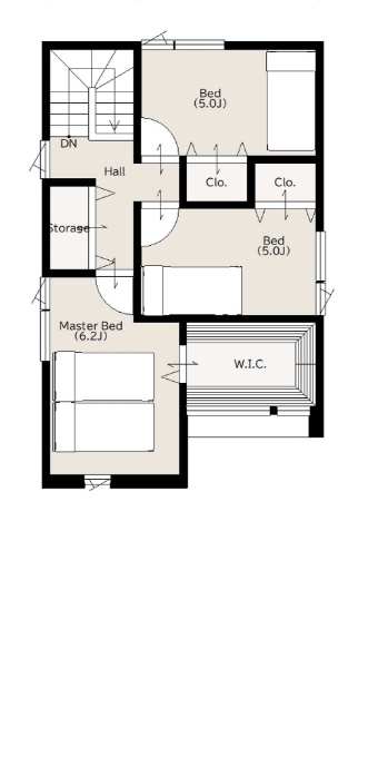 吹き抜けがあり明るいリビング。各所に収納があり整理整頓がしやすい間取り。